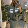 VERTICALE ZIJKANTEN – De jurk wordt geaccentueerd door verticale strepen langs de zijkanten, die het silhouet subtiel verlengen en een elegante look creëren. Dit detail zorgt niet alleen voor visuele interesse, maar benadrukt ook de natuurlijke lijnen van het lichaam. Het streepontwerp harmonieert met het kleurblokkerende jasje, waardoor de twee kledingstukken een samenhangend en stijlvol geheel vormen.